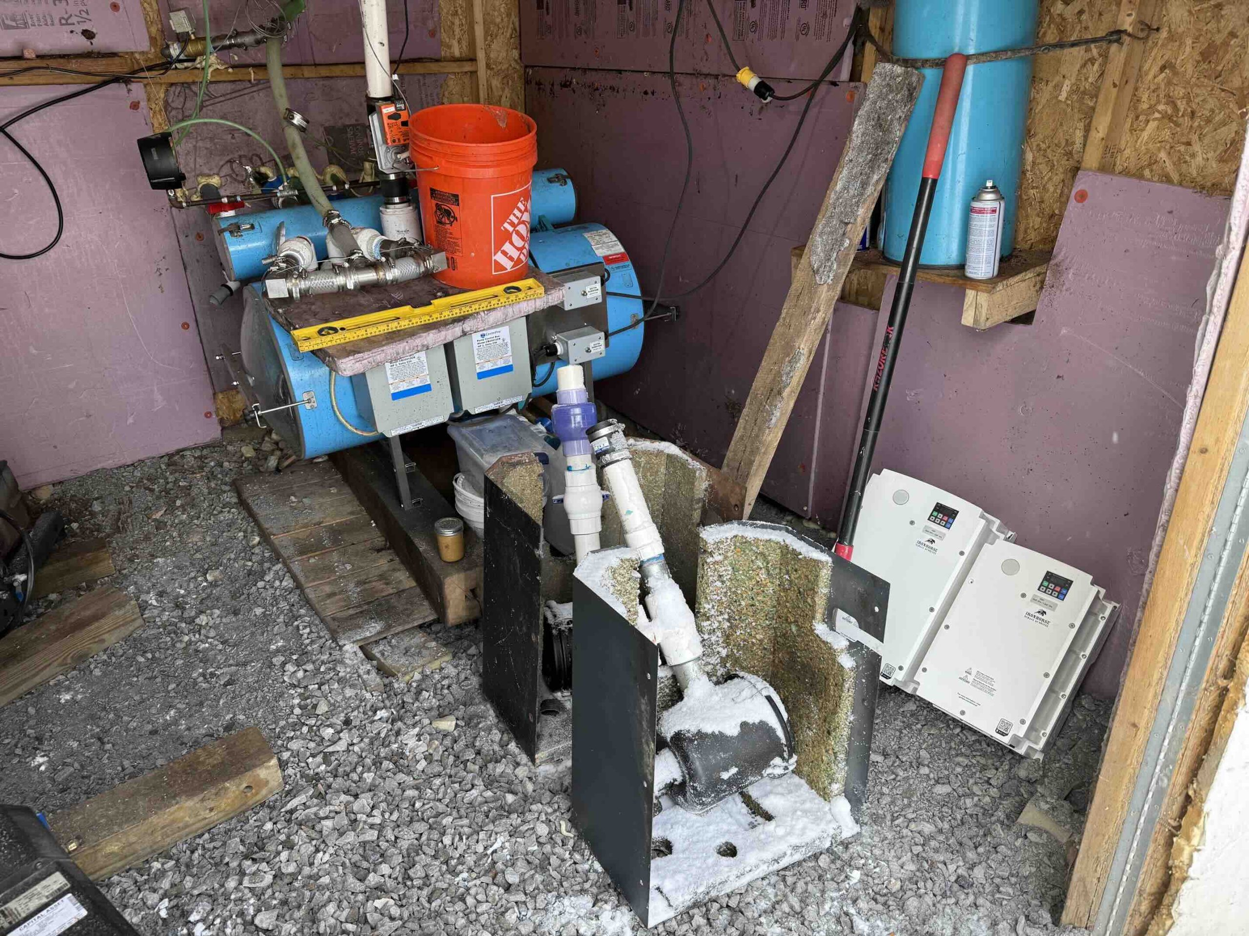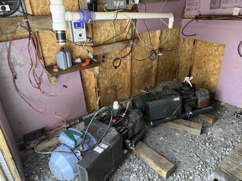Last year we posted about adding a second vacuum pump to our home pump house, and how one of the bearings went bad. Last month we had some help replacing the bearing on the first pump, and also replacing a damaged seal on the second pump. The seal showed signs of heat damage, which resulted in a little gearbox oil passing over to the claws and out the exhaust. Both pumps are ready to go, we just have to re-attach the VFDs and PVC inputs.