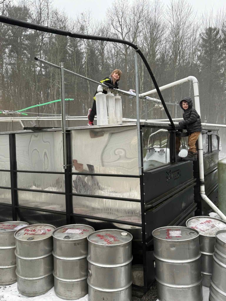 Our eleventh season is off to a great start. On Friday we filled a dozen barrels and still had enough chilled concentrate on hand to boil down another twelve drums on Monday. It took a few days for the woods to fully thaw, but with fresh tap holes and melting snow reserves, the sap ran strong all week. Tomorrow’s freeze should help recharge the trees’ sap reserves—and thankfully, this weekend gave us a chance to refill our own sleep reserves.