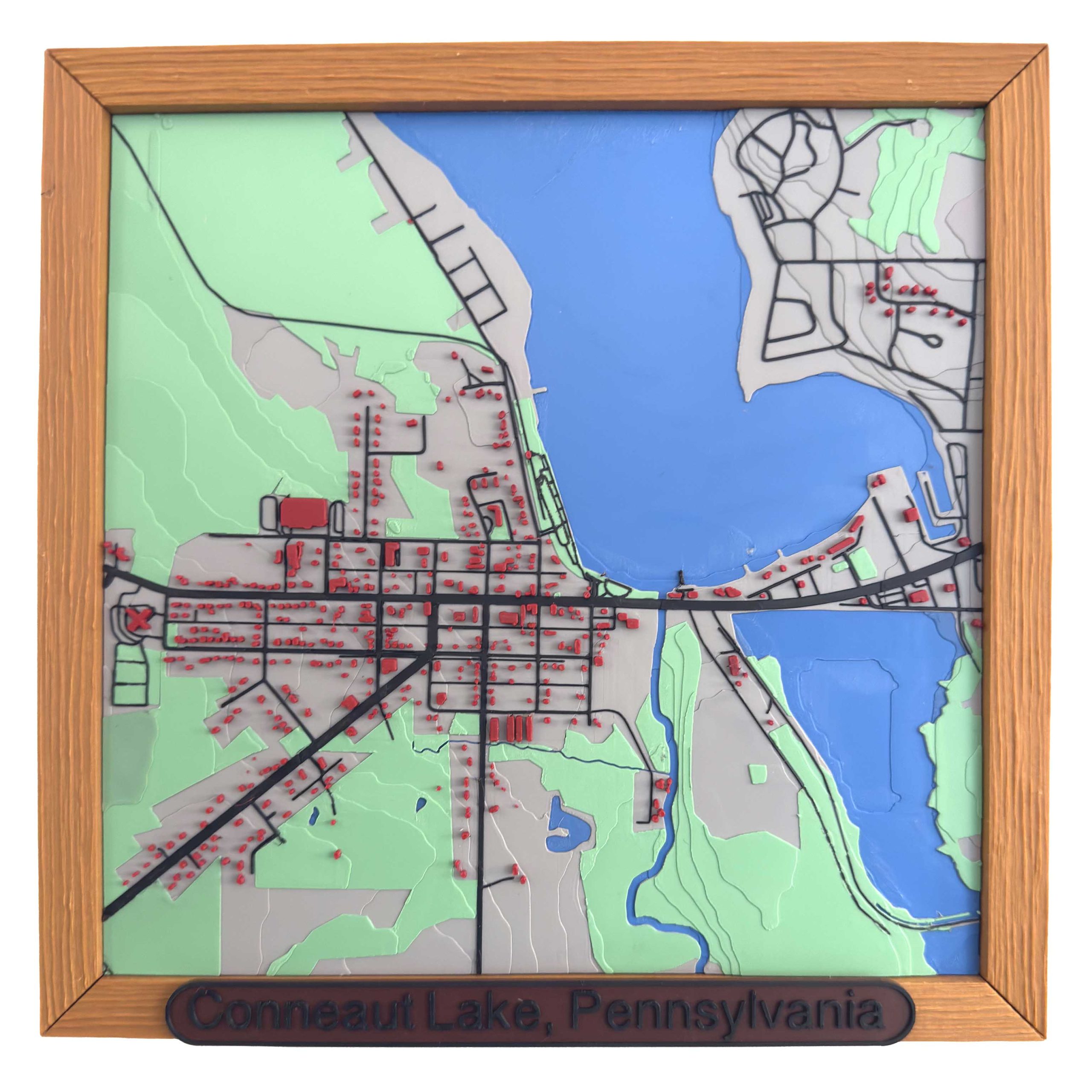 This detailed 3D printed map of Conneaut Lake, Pennsylvania beautifully captures the town’s layout and natural surroundings, highlighting its charming lakefront and intricate network of streets and landmarks. The elevation contours and color variations bring the area’s terrain to life, from the gentle slopes around the lake to the denser clusters of buildings at the town’s center. Framed in wood and labeled with a polished nameplate, the piece combines artistry and precision, serving as both a topographic model and a tribute to one of northwestern Pennsylvania’s most beloved lake communities.