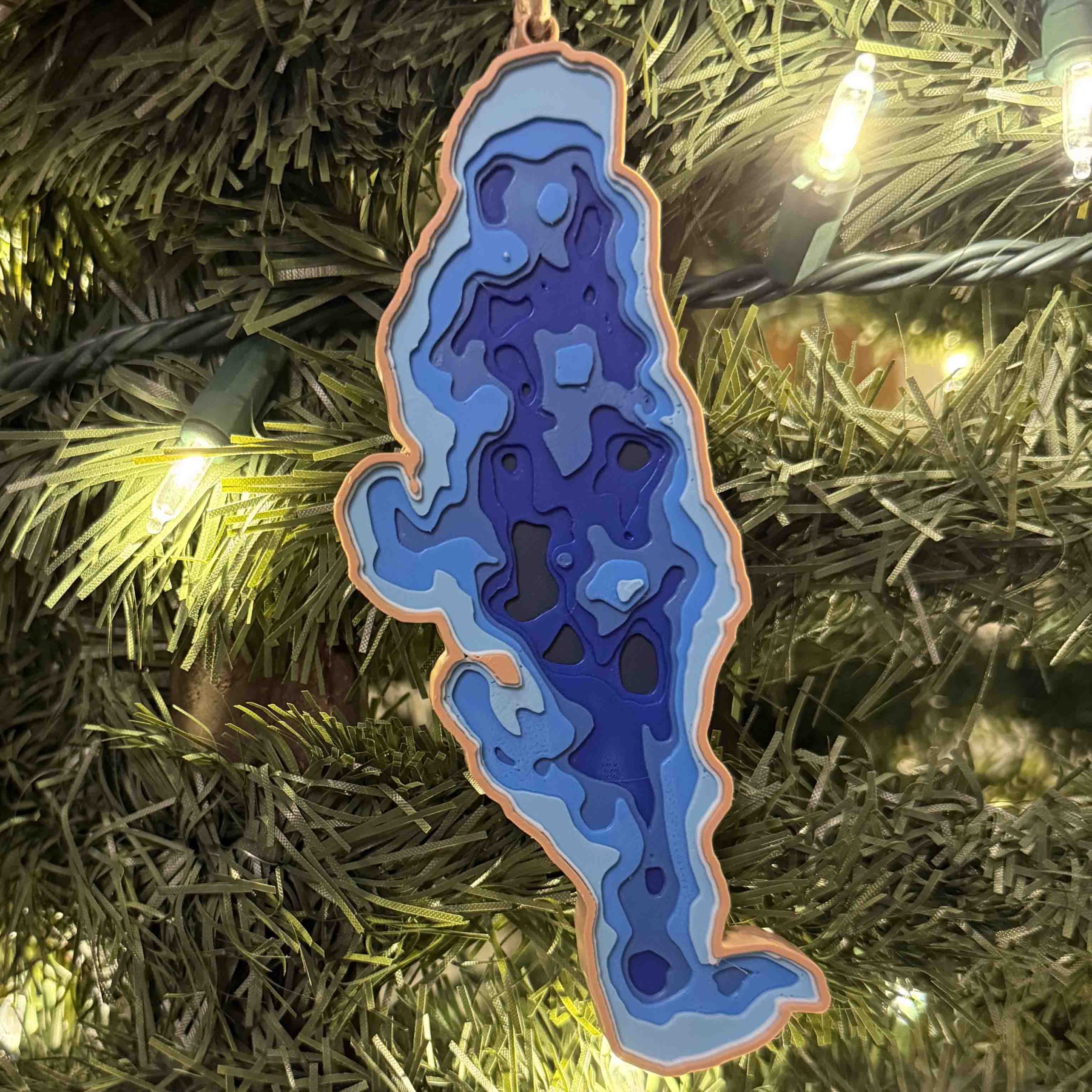 This image showcases a beautifully crafted 3D-printed depth map of Conneaut Lake, Pennsylvania’s largest natural lake. The layered design uses a gradient of blues to represent various depths, with darker hues indicating deeper regions and lighter blues depicting shallower waters. The precise contours mimic a topographic bathymetric chart, offering a striking visual representation of the lake’s underwater terrain. Framed with a subtle tan border and a small loop at the top for hanging, this piece functions both as a work of art and a tribute to the geographic beauty of Conneaut Lake.