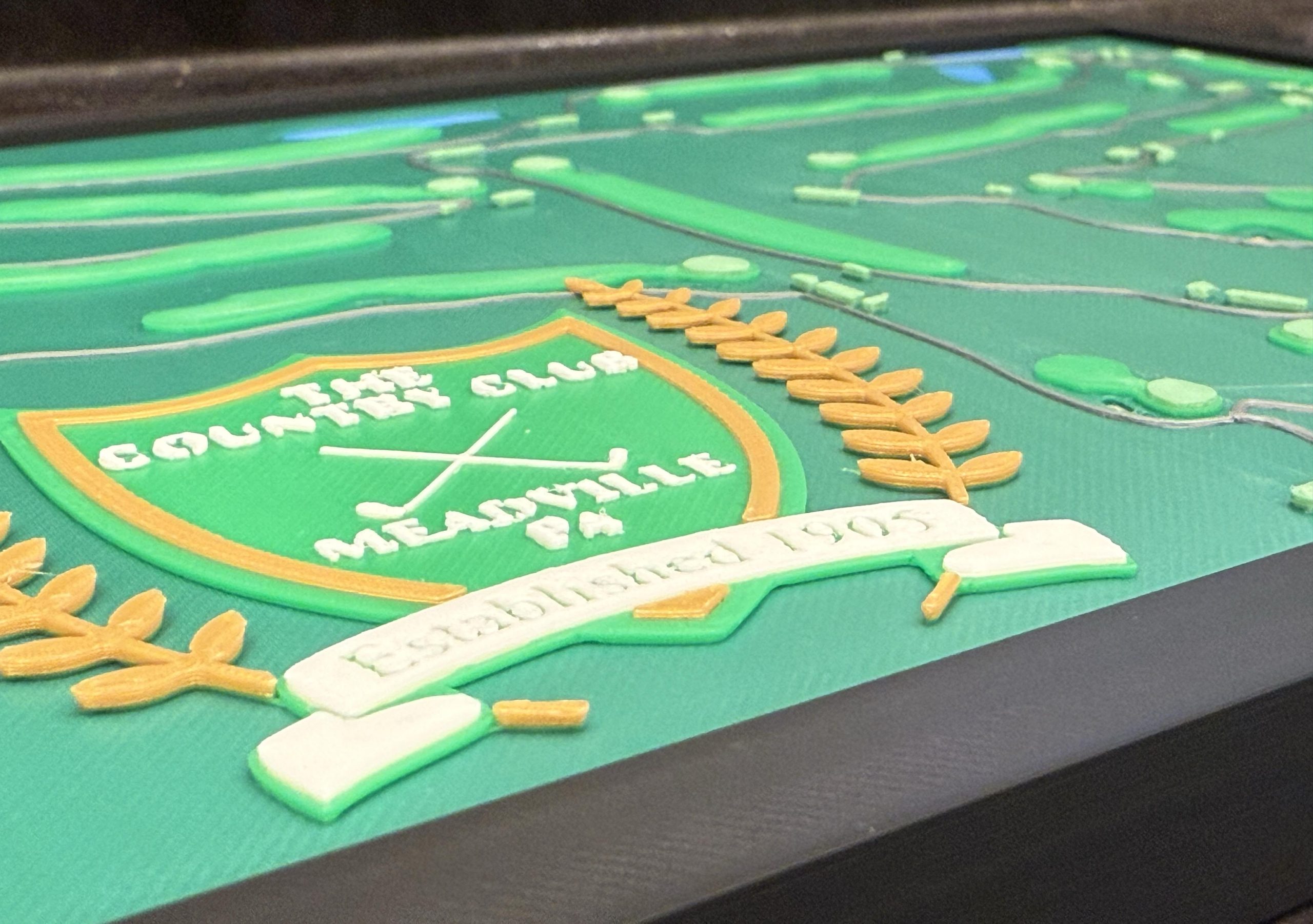 This framed 3D‑printed wall art beautifully illustrates The Country Club of Meadville golf course using layered relief rather than paint. Rendered in varying shades of green, it emphasizes the fairways, greens, bunkers, and water features with subtle depth and sculptural precision. The course layout floats on a clean green background inside a simple black frame, lending a minimalist, modern look. With the club’s name elegantly printed below the relief, the piece feels both personal and objective—perfect for enthusiasts who want a tactile yet refined tribute to one of western Pennsylvania’s oldest championship courses.